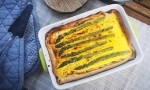 S testom obložimo pekač, vanj vlijemo zmes in na vrh goste zmesi položimo šparglje. Pečemo 30-40 min na 170° C.