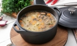 Pražimo približno pet minut, nato zalijemo z vročo jušno osnovo, po potrebi dosolimo in popopramo.