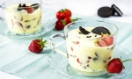 Jajčni šodo postrežemo v kozarcih ali skledicah, dodamo sveže sadje in piškote.