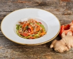 Kuhamo približno osem minut. Dve minuti pred koncem dodamo še na fino narezan ingver in bučke. Na koncu dodamo še maslo.