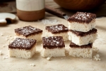S čokolado prelijte plast iz kokosa in mandljev. Prepričajte se, da ste s čokolado dobro prekrili celo pecivo. Postavite v zmrzovalnik za pol ure, da se čokolada strdi.