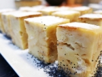 Star kruh/žemlje narežemo na rezine in nato na kocke (3 cm). Kruh stresemo v pekač (25 x 15 cm).