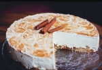 Torto okrasite s cimetovimi palčkami. Pred serviranjem jo pustite stati na sobni temperaturi 10 minut, da se podlaga nekoliko zmehča in jo boste lažje narezali. Postrezite jo ohlajeno.