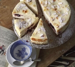 Model pazljivo postavimo na srednjo rešetko v pečici in pečemo 10 minut, nato posujemo s preostalimi mandljevimi lističi. Temperaturo znižamo na 110 °C in pečemo še 35 minut. Ugasnemo pečico, vrata pa pustimo zaprta; kolač naj ostane v njej še eno uro. Odpremo vrata pečice in jih še eno uro pustimo priprta (lahko jih zagozdimo s kuharsko rokavico). Kolač naj se nato še eno uro hladi na sobni temperaturi, potem pa ga pokrijemo in čez noč postavimo v hladilnik.
