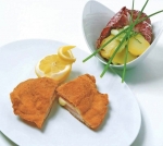4 svinjski (ali telečji) zrezki 4 debelejše rezine ementalca ali poljubnega poltrdega sira 4 rezine šunke jajce, moka in drobtine za paniranje sol sveže mleti poper olje ali kuhano maslo za cvrenje limona in krompirjeva solata za prilogo