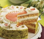 Preostali jogurtov nadev napolnimo v dresirno vrečko in na sredi torte oblikujemo krono, ob robu pa beljakove polovičke. Krono in nabrizgane beljakove polovičke napolnimo z mareličnim nadevom. Obod torte okrasimo s pistacijami.
