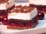 Stopljeno čokolado prelijemo po češnjevem želeju, vse skupaj še enkrat malo pogladimo, nato pa pladenj potresemo, da se vse lepo “razleze”.