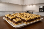 Mešanico prilijte k vrelemu mleku in med mešanjem kuhajte, dokler se ne zgosti. V vroč puding dodajte koščke čokolade in maslo. Mešajte, da dobite gladko kremo. Kremo pokrijte s folijo direktno po površini, da se ne naredi skorjica.3. Sestavljanje in peka Pečico ogrejte na 200 °C. Testo razdelite na dva enaka dela. Prvi del razvaljajte na velikost pekača in ga položite na dno. Drugi del zavijte v folijo in za 15 minut postavite v zamrzovalnik. Na testo enakomerno razporedite čokoladno kremo. Ohlajen drugi del testa naribajte po kremi. Po želji potresite s čokoladnimi kapljicami ali lešniki. Pecite približno 20 minut, da vrhnji del rahlo porumeni. Popolnoma ohlajeno sladico narežite na kocke.