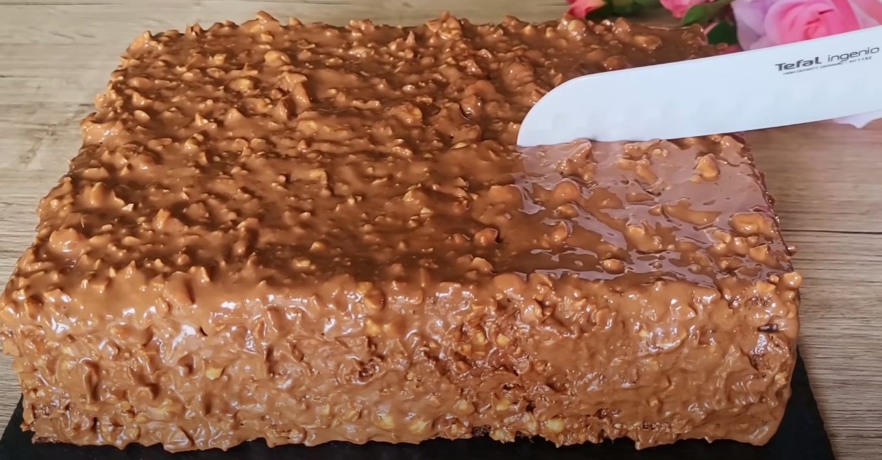 V posodi stopimo čokolado in ji prilijemo olje. Vmešamo zdrobljene lešnike in prelijemo čez pecivo.