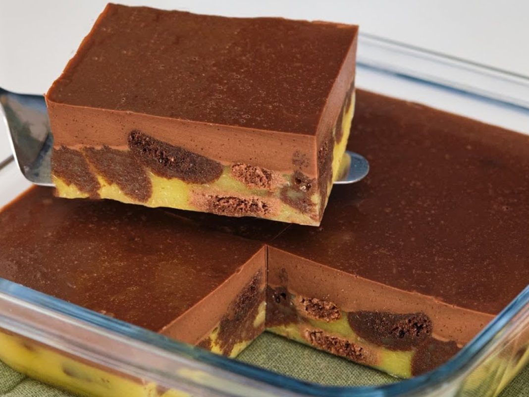 Preko njih polijemo pomarančno zmes in damo v hladilnik. V lonec damo kakav, sladkor, agar agar in mleko. Dobro premešamo in kuhamo 5 minut. Ko je zmes gotova, jo prelijemo čez prvo plast in postavimo nazaj v hladilnik, dokler se ne strdi.