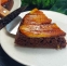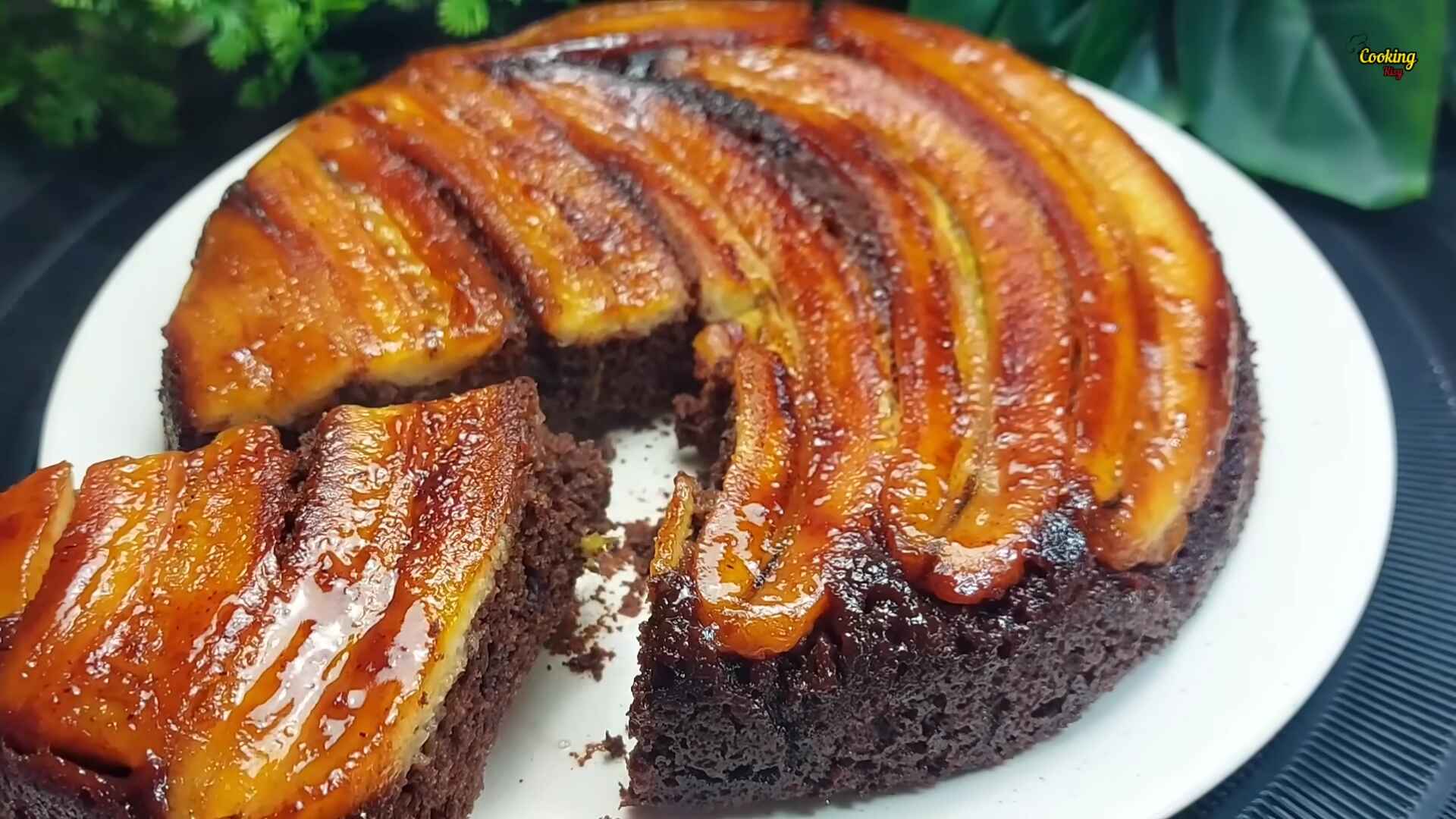 Če je testo pečeno, enostavno preverimo z zobotrebcem. Če zobotrebec ostane suh, ko ga zapičimo v testo, je okusna sladica pripravljena. Preostane nam le še, da jo položimo na krožnik, in sicer tako, da je del z bananami na vrhu.