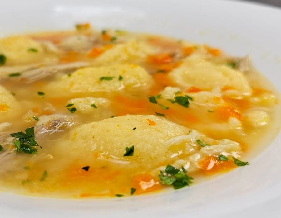 V juhi segrejemo žlico, nato zmanjšamo temperaturo in nežno spustimo naše cmoke.