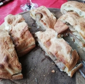 Ombolo v testu s pršutom, sirom in gobovo omako