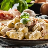 Njoki iz sladkega krompirja s pršutom in šparglji
