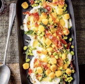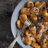 Njoki iz ponve z bobom, pršutom, rikoto in žajbljem