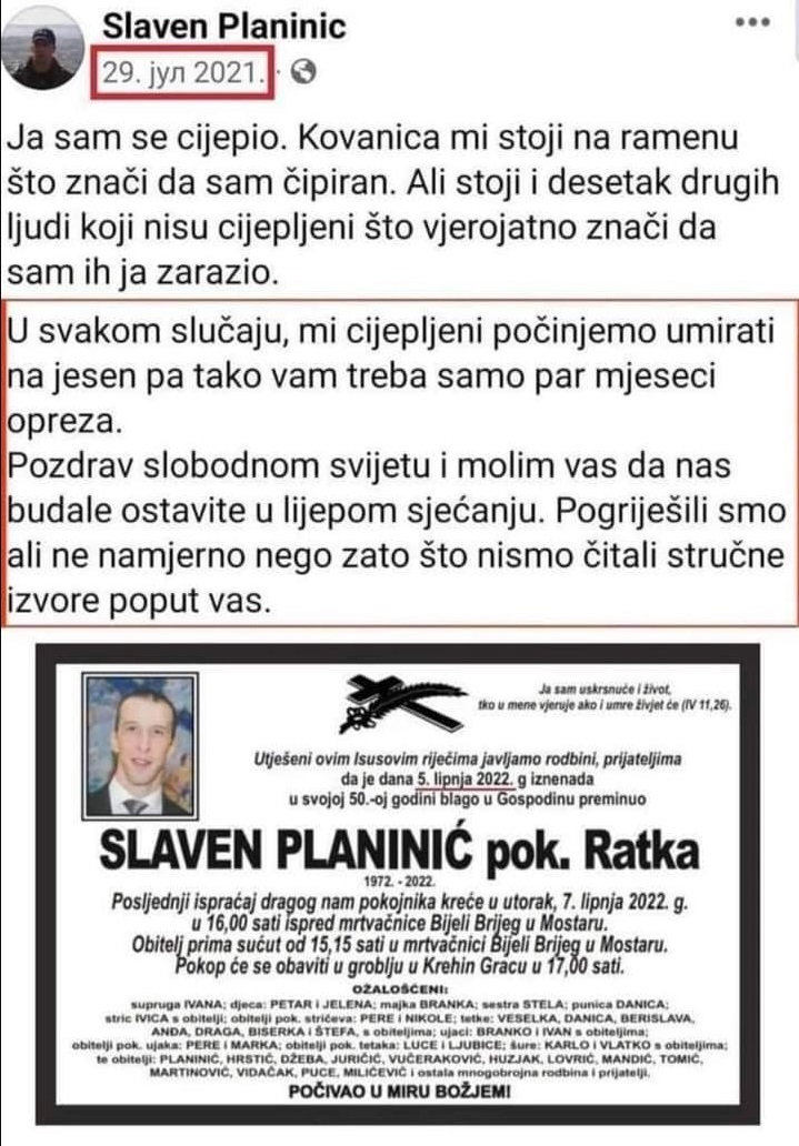 Njega za časa njegovega življenja živ bog ni mogel prepričati. Takšnih hodi po svetu večina in žal bodo takšni do konca. Ne vem ali je kriv ponos, pomanjkanje inteligence, pretirana samozavest, ignoranca ali kaj tretjega recimo žrtvovanje za druge. Hipnotični miselni vzorec: Nosim masko, cepim se, kodiram se, da lahko živim, zaščitim druge, pa četudi na koncu umrem!