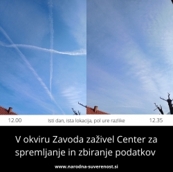 Včeraj sem bil v Ljubljani cel dan in sem tako kot vsaki drugi dan večkrat pogledal v nebo in ves dan opazoval na nebu ogromno črt, ki so jih puščala za sabo letala. Veliko teh črt so se počasi pretvorile v meglice, ki so na nebu vztrajale ure. Tisti ta normalni, ki verjamejo »znanosti« bodo rekli, da je to normalno, mi teoretiki zarot, ki tudi verjamemo »znanosti«, pa pravimo da to ni, ne more biti ne normalno, ne naravno, ampak so to tako imenovane kemijske sledi s pomočjo katerih nas zastrupljajo, onesnažujejo okolje ....