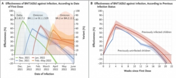 V diagramu B vidimo rdeče in modre črte – ki predstavljata otroke, ki so bili cepljeni in so bili predhodno okuženi oziroma še niso bili okuženi – spet gredo skozi nič s strmim padcem v petih mesecih po cepljenju. Dejstvo, da se tudi pri cepljenih, ki imajo naravno imunost zaradi predhodne okužbe, vidi negativna učinkovitost, je presenečenje, saj ne bi pričakovali, da bodo tisti z naravno imunostjo bolj dovzetni za okužbo kot tisti brez nje.