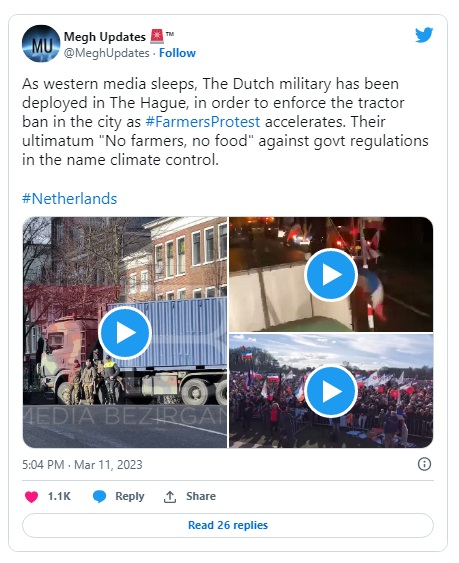 Policija v Haagu je sporočila, da je v bližini mesta ustavila skupino traktorjev in kmetom naročila, naj se na protest odpeljejo z avtobusom.