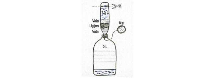 Nato nogavico z ogljem dobro pritisnemo na položeno plast medicinske vate, tako da se plast oglja povsod dobro oprime sten stekleničke. Plast premoga v steklenici mora biti debela vsaj 7-8 cm.