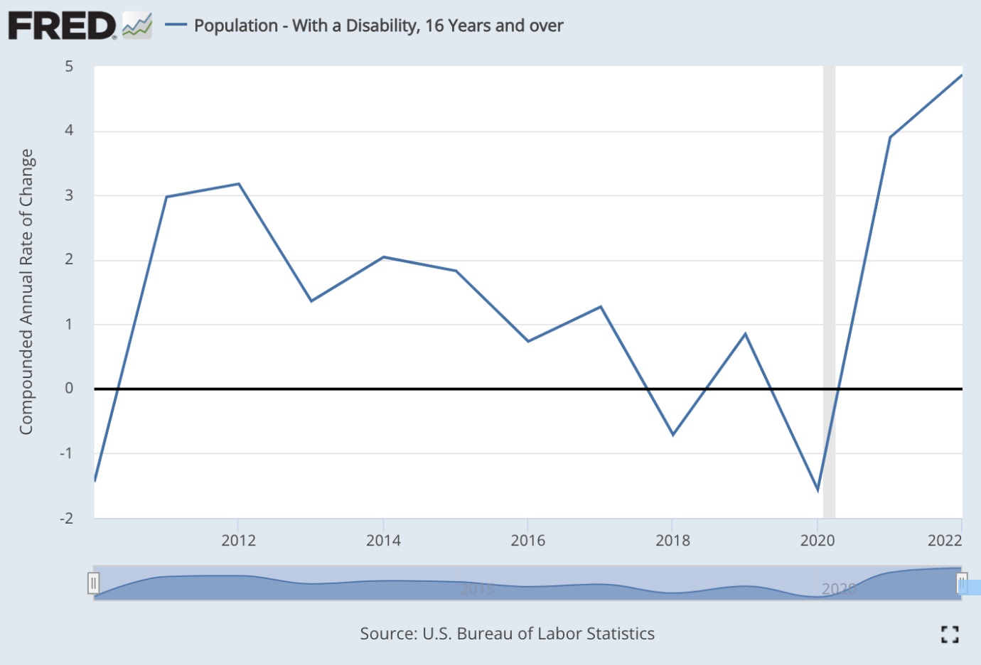 Če gre verjeti koronski zgodbi, bi moralo število invalidov strmo narasti, sploh leta 2020, ko je krožila nevarnejša prvotna varianta. A do tega porasta je prišlo šele leta 2021 – takoj po začetku množičnega cepljenja. To kažejo podatki ameriškega urada za statistiko dela, ki jih je pripravila Federal Reserve Bank of St. Louis. Corona skavt Stefan Homburg je danes komentiral na Twitterju: "Ko je Corona leta 2020 prizadela "nezaščiteno" prebivalstvo ZDA, je vse ostalo normalno. Od leta 2021 se je število invalidov povečalo za 4 milijone.«