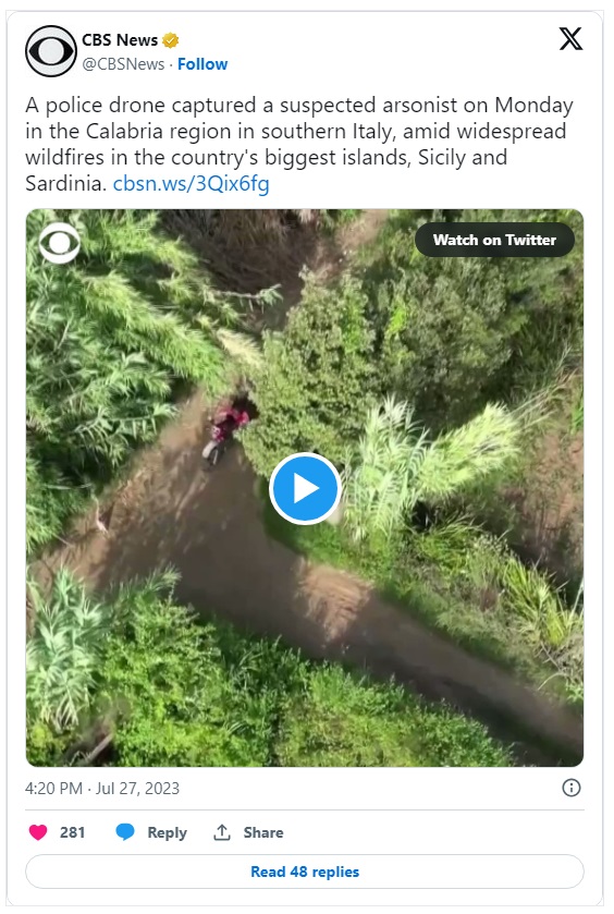 V začetku tega tedna so policijski posnetki z dronom v južni italijanski regiji Kalabrija dejansko ujeli moškega, ki je očitno poskušal zanetiti požar.