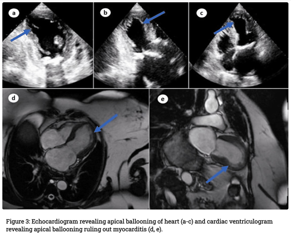 Študija primera Reza et al. , ki je bil objavljen v "Cureusu" 10. avgusta, se začne z znanim zagotovilom, da so cepiva proti covidu dejansko tako ali tako precej varna in učinkovita, nato pa ugotavlja, da je cela vrsta srčno-žilnih stranskih učinkov - miokarditis, perikarditis, mioperikarditis, miokardni infarkt, pljučni embolija, trombotična trombocitopenija in pljučna krvavitev – so bili znani, novi pa bodo še znani. Eden od njih: Takotsubo kardiomiopatija (TCM). Opisan je primer 59-letnega bolnika, ki je prišel na urgenco s težko sapo, ki je trajala šest ur, poleg tega pa je tožil zaradi ponavljajočih se bolečin v prsih zadnja dva dni. Tri dni prej je prejela cepivo Moderna Covid. V anamnezi je imela hipotiroidizem, povišane lipide v krvi in celiakijo, vendar pred cepljenjem ni imela težav s srcem.