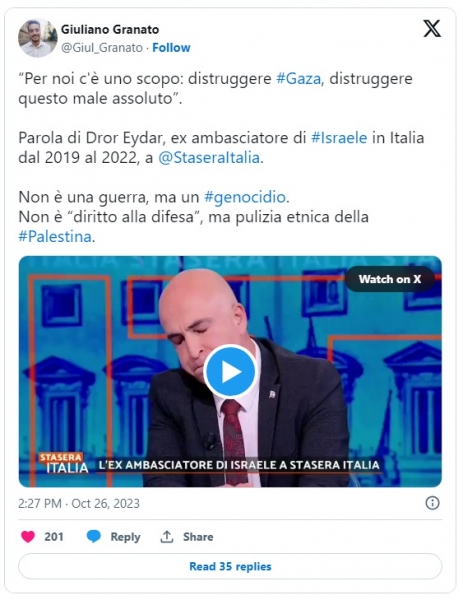 Dror Eydar, nekdanji izraelski veleposlanik v Italiji, je v četrtkovem televizijskem intervjuju za italijanski kanal Rete 4 dejal: "Za nas je samo en cilj: uničiti Gazo, uničiti absolutno zlo".
