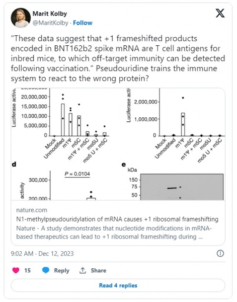 V študiji, objavljeni v recenzirani reviji Nature Journal, so raziskovalci najprej cepili miši s "cepivi" Pfizerja in AstraZenece in ugotovili, da je pri Pfizerjevih "cepivih" znatno večja verjetnost, da proizvajajo proteine s premikanjem okvirja.