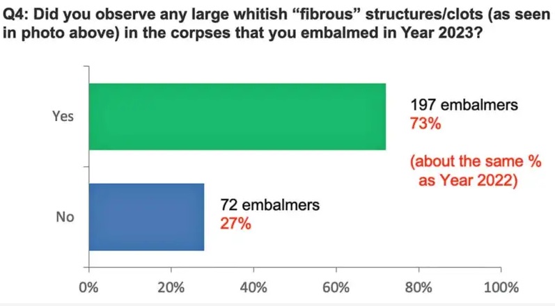Skoraj 80 % anketirancev je poročalo, da ima povprečno 25 % trupel mikrostrdke, kar dokazuje "kavni usedlini" podoben material v krvnem obtoku. Nekateri balzamirji so videli te strdke v veliko večjem odstotku trupel.