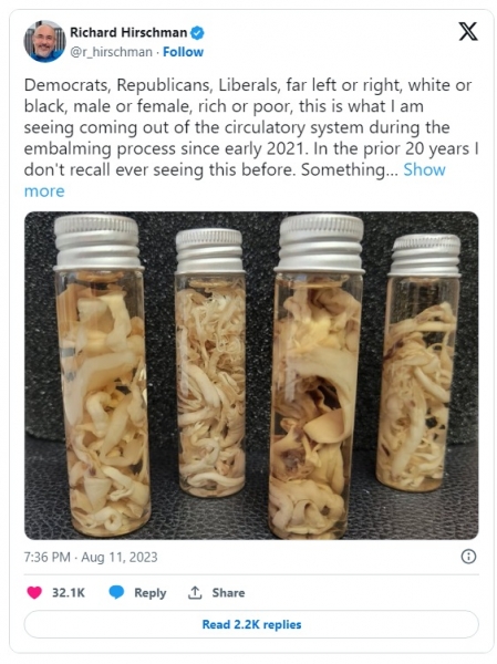 »Leta 2022 je bilo v našem podjetju več smrti dojenčkov kot kadar koli prej. Leta 2023 sem opazil več belih fibroznih strdkov, kot sem jih kdaj videl, zlasti pri starejših ljudeh.«