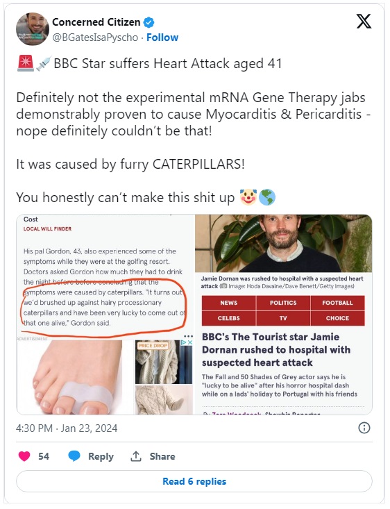 Cepljenega igralca Jamieja Dornana so hospitalizirali po simptomih srčnega infarkta, glavni mediji pa so zgodbo po vsem svetu prepisali, da bi se izognili resnici, da je smrt povzročilo cepivo mRNA.