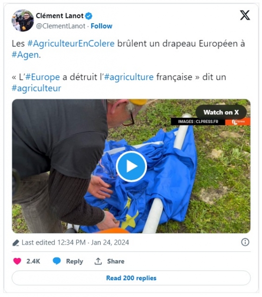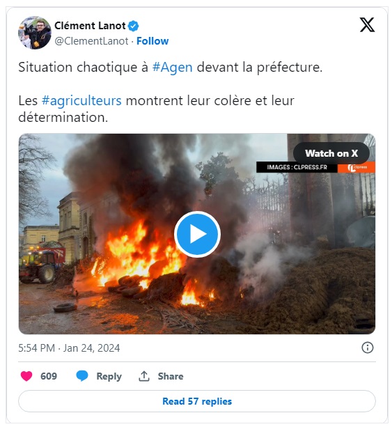 Kmetje so zažgali tudi bale sena in gume pred stavbo prefekture. Pozneje dneva so se kmetje na tem območju posneli tudi med sežiganjem zastave Evropske unije.