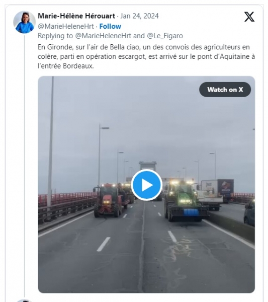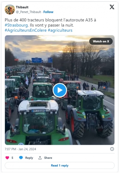 Medtem je na stotine traktorjev blokiralo glavne avtoceste, vključno z A35 v bližini Strasbourga. Žirondinski kmet je postavil cestne zapore tudi na akvitanskem mostu zunaj Bordeauxa.