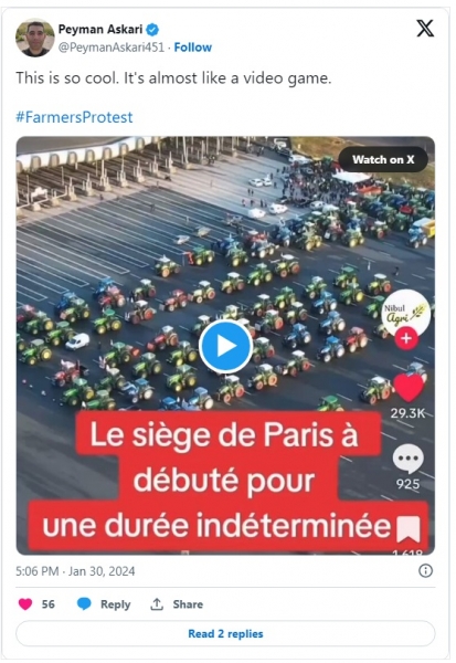 Kmetje v Franciji, Nemčiji, na Nizozemskem, Poljskem, v Belgiji, Romuniji in drugih državah po Evropi protestirajo proti radikalnim levičarskim vladam tako, da s traktorji blokirajo glavna prometna omrežja. To razširjeno populistično gibanje preplavlja Evropo v času, ko čezmerna regulacija, davki in agenda podnebnih sprememb ogrožajo preživetje ne le kmetov, temveč ljudi iz delavskega razreda, in vse to se dogaja mesece pred začetkom evropskega volilnega cikla junija.