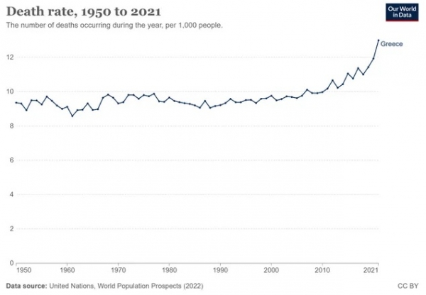 Kot lahko vidite, stopnja umrljivosti v Grčiji že desetletja iz leta v leto pada. Dokler se leta 2021 ni nekaj spremenilo.