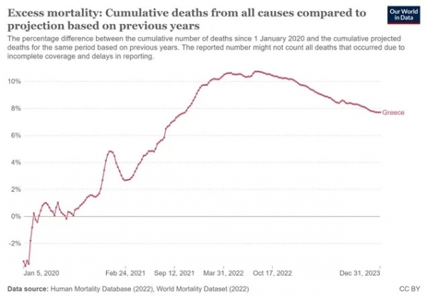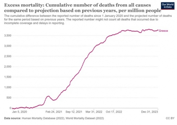 Vendar pa grška vlada ni omenila smrtonosnih učinkov cepljenja proti covidu mRNA, ki je bilo uvedeno leta 2021, kljub statističnim podatkom o nenadnih in nepričakovanih smrtih, ki so v popolni usklajenosti z uvedbo skokovito narasli.