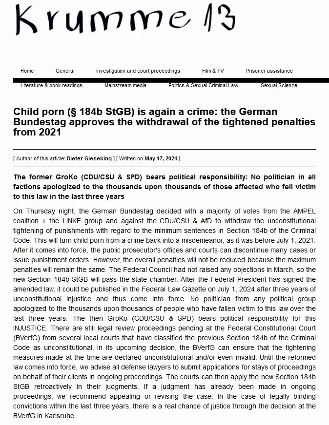 Aktivistična skupina Krumme-13, ki se zavzema za pedofilijo, je tudi napovedala, da bo zahta razveljavitev kazni pedofilom, obsojenim po starem zakonu, medtem ko trdijo, da je veliko pedofilov žrtev otrok, ki želijo imeti odnose s "pedoseksualci" .