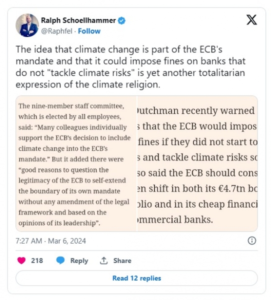 Podnebna religija tako vpliva na vedno več področij gospodarskega življenja. Cilj podjetij v zasebni lasti (vključno z bankami) je zaslužiti denar – ne pa ga zažgati. Toda politika ECB na koncu zahteva prav to. Ali se v takšne finančno nedonosne naložbe vlaga več denarja ali pa morajo banke plačevati strašne kazni.