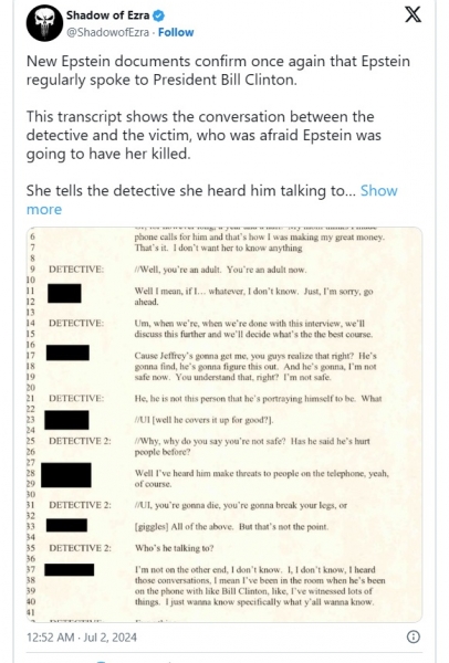 V enem od transkriptov priča potrjuje, da sta se Epstein in Clinton pogovarjala po telefonu.