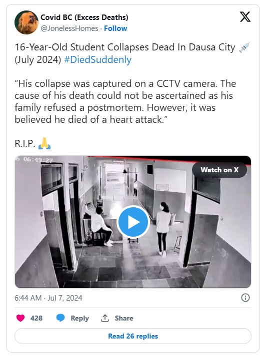 V Indiji se je 16-letnik zgrudil na hodniku svoje šolske zgradbe in umrl. V tistem trenutku ni bil izpostavljen nobenim posebnim fizičnim naporom. Članek v indijskih medijih je omenil podoben primer, ko se je decembra lani 14-letni deček zgrudil pred svojim razredom in umrl zaradi srčnega infarkta. V Indiji te primere imenujejo "tihi srčni napadi".