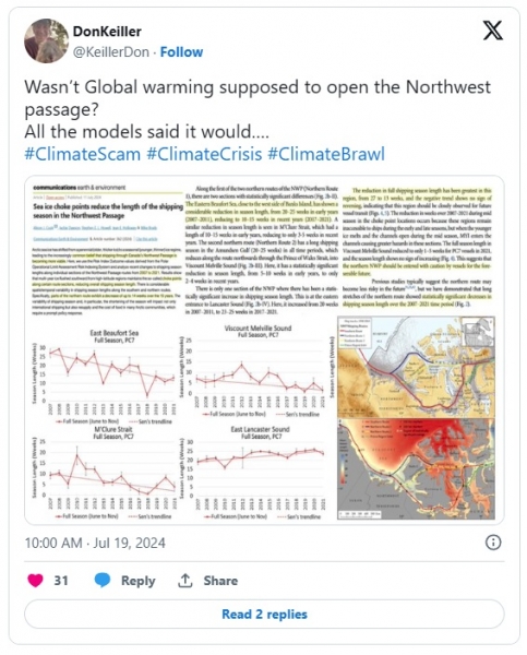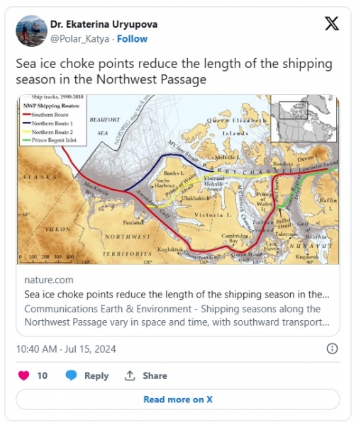 Nova študija, objavljena v reviji Nature o plovbi v kanadskem severozahodnem prehodu, z naslovom “Ozka grla morskega ledu skrajšajo dolžino navigacijske sezone v severozahodnem prehodu,” zdaj kaže, da se je poletna ladijska sezona v regiji dejansko znatno skrajšala. Pot skozi vzhodno Beaufortovo morje ustvarja vse več lednih ozkih grl. To skrajša čas plovbe s 27 tednov (tj. približno pol leta) na samo 13 tednov – ali približno četrtino leta. Po mnenju znanstvenikov ni znakov, da bi se trend obrnil.