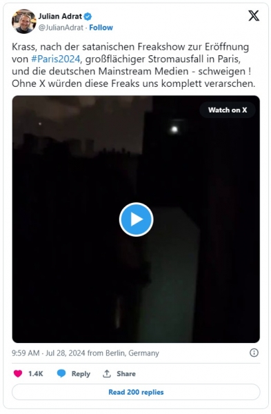 Francija je šokirala, ko je odprla olimpijske igre s satansko čudaško predstavo, ki se je n.o.r.č.e.v.a.l.a iz krščanske vere. Kmalu zatem je v več soseskah zmanjkalo elektrike. Na X (prej Twitterju) kroži fotografija, ki prikazuje popolnoma črno mesto – nad mestom s hriba bdi le krščanska bazilika Sacre Coeur. Mnogi krščanski verniki to vidijo kot znak.