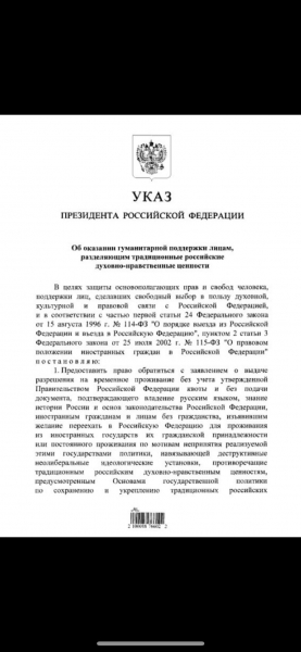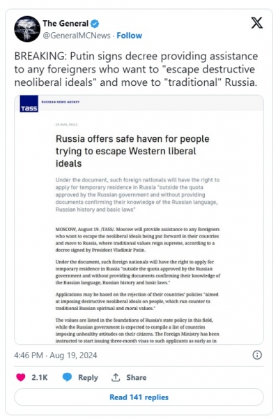 Za zdaj Vladimir Putin postopoma konceptualizira Rusijo kot zatočišče konservativnih, tradicionalnih vrednot, kjer levo-liberalni "voceizem" in destruktivne spolne ideologije nimajo mesta. Glede na dejstvo, da so konservativni ljudje na tako imenovanem vrednostno usmerjenem Zahodu vse bolj sovražni do liberalnih globalističnih elit, bi lahko odlok, ki ga je potrdila ruska vlada, privabil na tisoče ljudi.