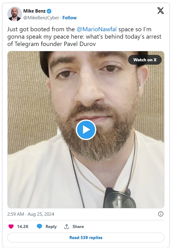 "Torej ne želijo uničiti Telegrama, kot so želeli uničiti Wikileaks. Želijo ga nadzorovati. In težava je bila v tem, da na Pavla niso imeli dovolj pritiska, da bi zlomili njegovo voljo. Tako je živel v Dubaju. Zdaj imajo vzvod. Menim, da je to namen tega pregona: ne vzpostaviti pravnega precedensa, da je za vsako šifrirano aplikacijo za klepet njen ustanovitelj osebno odgovoren za nezakonite pogovore ali transakcije na platformi, ampak prisiliti Telegram, da postane WhatsApp.
