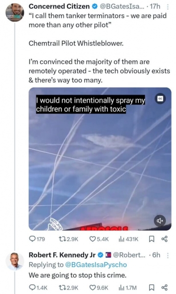 Robert F. Kennedy Jr. nedavno je povzročil paniko v vladi, ko je obljubil, da bo ustavil vladne tajne operacije s kemičnimi sledmi, ki zastrupljajo Američane in državljane drugih narodov. Po besedah člana Trumpove predvolilne ekipe se zbirajo dokazi, pripravljajo se nalogi za aretacijo in tožilci so pripravljeni uničiti kriminalni kartel, ki je za lastne namene uporabljal operacije škropljenja v stratosferi.