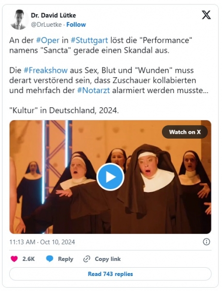 Tako je videti osvobodilni udar proti domnevnemu krščanskemu zatiranju:Državna opera v Stuttgartu izda naslednje »opozorilo Predstava prikazuje eksplicitna spolna dejanja ter upodobitve in opise (spolnega) nasilja. Videti je mogoče tudi pravo in lažno kri, vbodne procese in rane. V predstavi so uporabljeni stroboskopski učinki, volumen in kadilo.