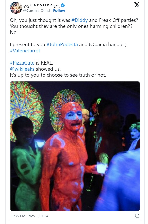 Musk je pred ameriškimi volitvami posvaril pedofilsko elito z objavo sporočila nad člankom o Johnu Podesti in njegovem prijatelju Sladeu Sohmerju, novinarju, ki je leta 2016 "razkrinkal" Pizzagate kot neutemeljeno zaroto in bil pozneje leta 2023 aretiran zaradi obtožb zlorabe otrok. ..
