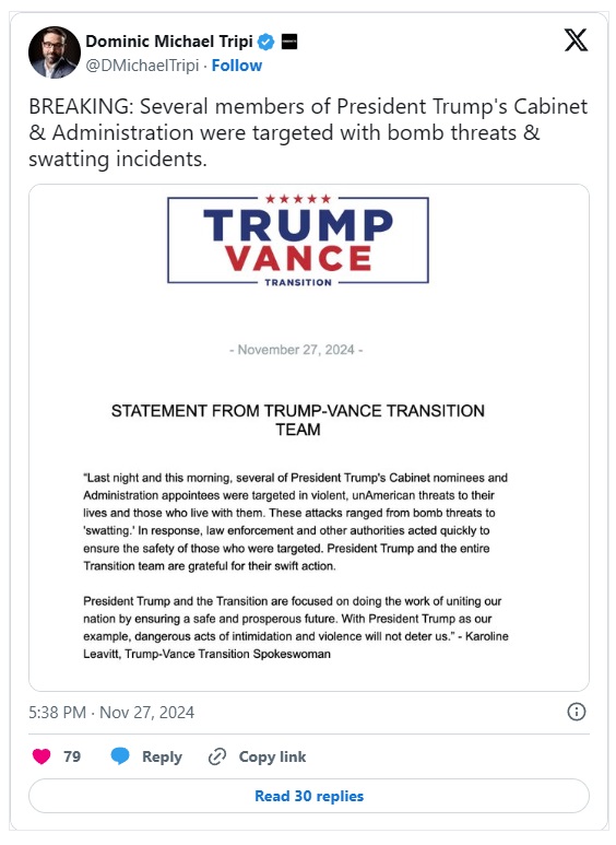 Trumpova predsedniška tranzicijska ekipa je objavila izjavo, v kateri je pojasnila, da je več članov prihajajočega kabineta in administracije prejelo grožnje, medtem ko so bili drugi pretepeni.