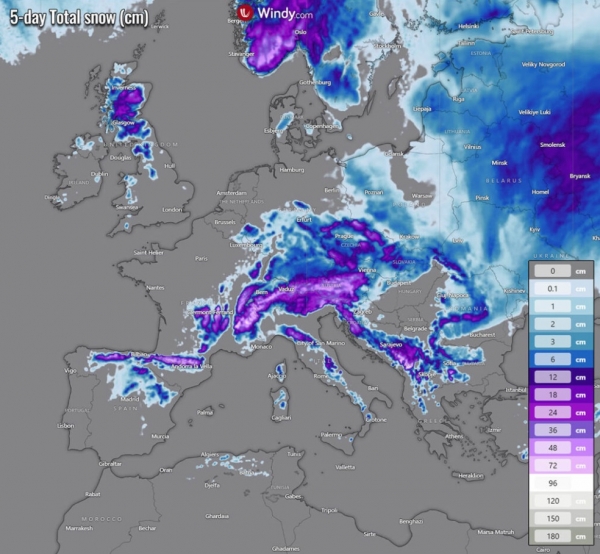 Spodaj je prikazano skupno število petdnevnih snežnih padavin v celinski Evropi. Sneg je napovedan za številna območja, vključno s severom Velike Britanije, severom Pirenejskega polotoka, alpskim območjem, zahodnim Balkanom in srednjo Evropo. Več snega pričakujejo tudi v vzhodni Evropi in Skandinaviji.
